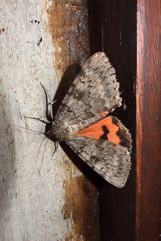 Sanftes Stupsen bewegt den Falter zum teilweise Öffnen eines Hinterflügels. Informationen zum Tier: Art: Catocala puerpera (Catocala puerpera). |