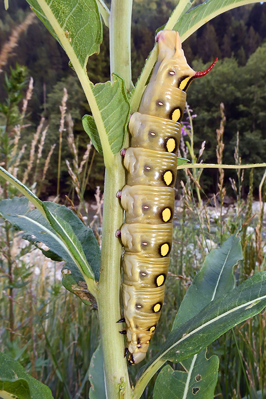 Körperlänge bis 100 mm. Die Körperlänge des abgebildeten Tieres beträgt 80 mm. Fundort: Flussufer, an Wald-Weidenröschen (Epilobium angustifolium) fressend. |