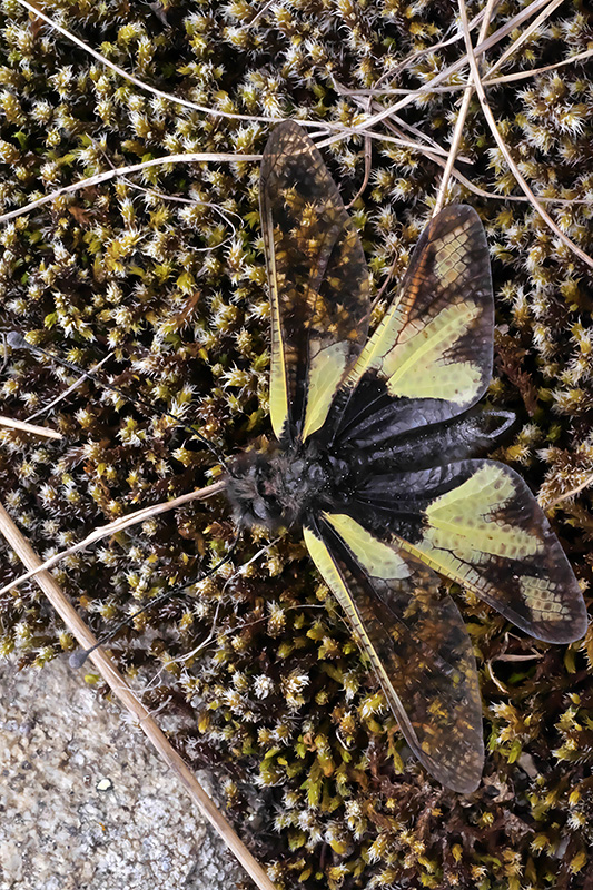 Gelegentlich bewegt sich das auf die Sonne wartende Tier leicht. Informationen zum Tier: Art: Libellen-Schmetterlingshaft (Libelloides coccajus). |