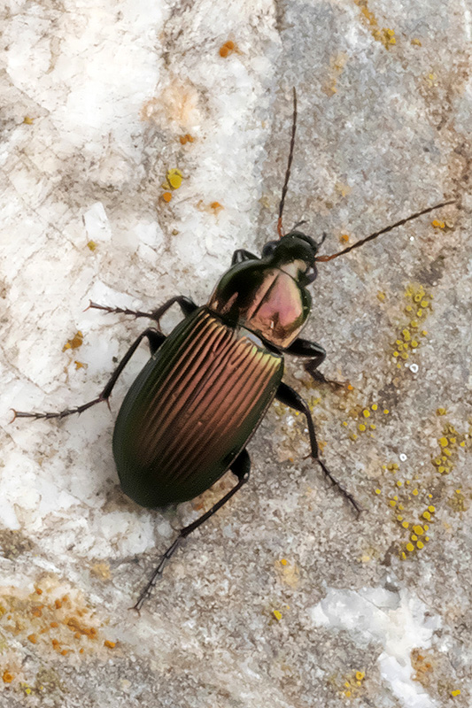 Ein Kupferfarbener Buntgrabläufer verharrt für einem kurzen Moment auf einem Stein. Informationen zum Tier: Art: Kupferfarbener Buntgrabläufer (Poecilus cupreus). |