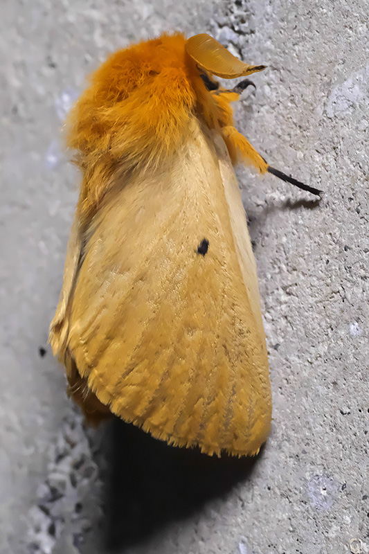 Die lang und dicht gekämmten Fühler sowie der schwarze Diskoidalfleck auf dem Vorderflügel weisen ihn als Männchen aus. Informationen zum Tier: Art: Löwenzahnspinner (Lemonia taraxaci). |