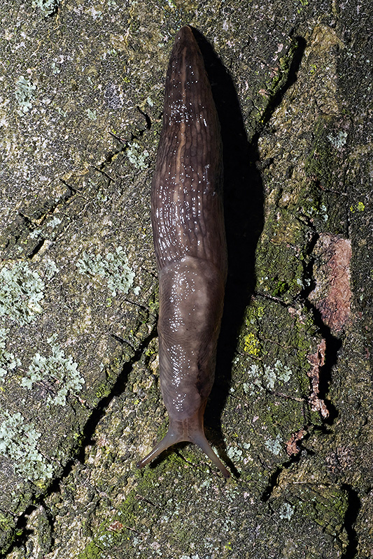 Ein nächstes Tier ist nahezu durchgängig dunkel eingefärbt. Informationen zum Tier: Art: Baumschnegel (Lehmannia marginata). |