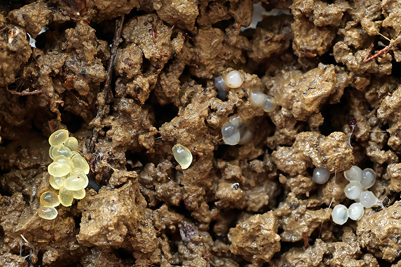 Eier michigweiss, oval, Grösse 2 × 2,7 mm. Der Durchmesser der abgebildeten Eier beträgt um 2,7 mm. Fundort: in Terrarium abgelegt. |