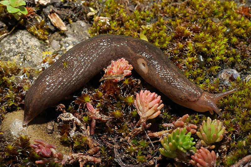 Gut erkennlich ist das nahezu zeichnungslose, helle Atemloch der Schnecke. Informationen zum Tier: Art: Gewächshausschnegel (Ambigolimax valentianus). Artzugehörigkeit: Durch Sektion anatomisch abgesichert. |
