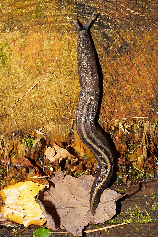 Der Schnegel aus der Vogelperspektive betrachtet. Informationen zum Tier: Art: Schwarzer Schnegel (Limax cinereoniger). |