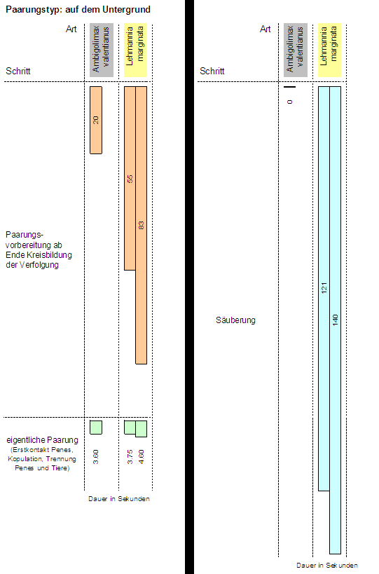 Vom Zusammentreffen zweier Tiere über die Verfolgung und Kopulation bis zur Trennung vergehen meist weniger als 5 Minuten.