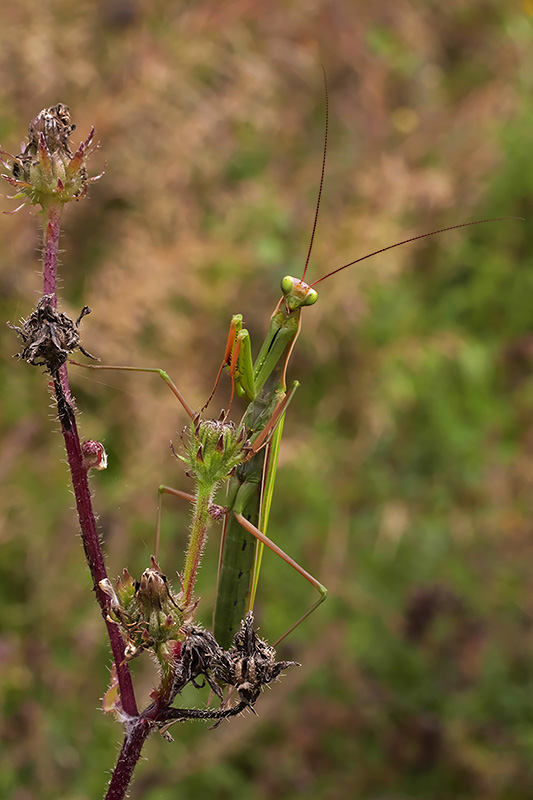 Kurz nach dieser Aufnahme fliegt es davon, wohl von der näher kommenden Kamera genervt ... Informationen zum Tier: Art: Europäische Gottesanbeterin (Mantis religiosa). |