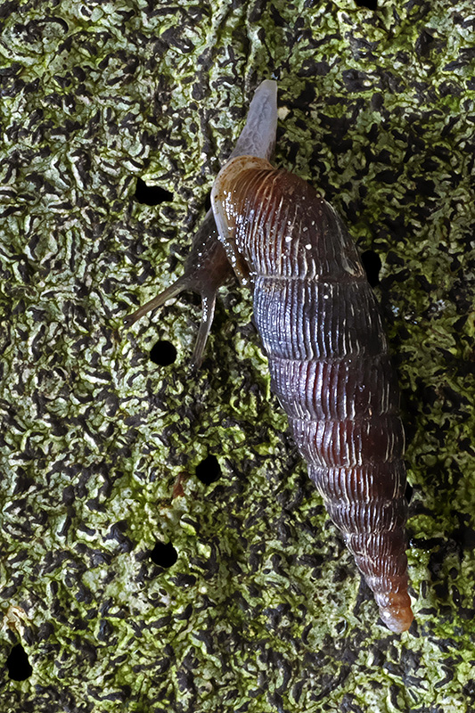 Auf ein Stück mit Flechten überzogene Rinde gesetzt, kriecht die Schnecke davon. Informationen zum Tier: Art: Mittlere Schliessmundschnecke (Macrogastra attenuata lineolata). |