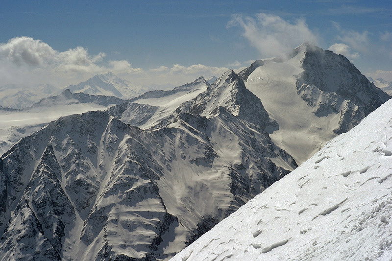 Langsam schwindet das Gewölk, der Blick hinüber zum Oberalpstock mit dem eingelagerten Staldenfirn wird frei. Links davon die scharfe Pyramide des Chli Oberälplers, dahinter über dem Brunnifirn der Piz Ault und der Piz Acletta. Markant im Hintergrund der Scopi am Lukmanierpass. |