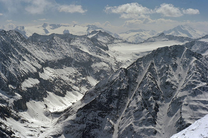 Rechts anschliessend im Vordergrund der Stotzig Grat, der Piz Cavardiras und der Fruttstock, mit dem Piz Acletta dahinter. Im Hintergrund die Medelser-Gruppe mit dem Piz Medel, dem Piz Uffiern und dem Piz Cristallina. Links der Medelser-Gruppe das Rheinwaldhorn, rechts die Cima della Bianca und der Scopi. |