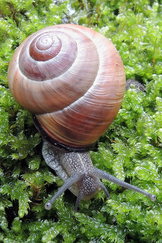 Diese durch ihr braunes, bänderloses Gehäuse ideal getarnte Hain-Schnirkelschnecke habe ich auf meinem Mirabellenbaum entdeckt. Zur Aufnahme wurde die Schnecke auf ein Moospolster gesetzt. Informationen zum Tier: Art: Hain-Schnirkelschnecke (Cepaea nemoralis). |