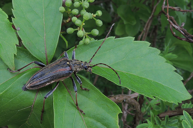 Nach der definitiven Bestimmung entlasse ich den Käfer wieder in seine angestammte Freiheit. Informationen zum Tier: Art: Schulterbock (Oxymirus cursor). Verbreitung: Nördliche Paläarktis - Europa ohne südliche Teile, nördliches Asien. Regionale Verbreitung Alpen: Er bevorzugt höhere Mittelgebirgslagen sowie die subalpine Zone. Lebensräume: Nadel- und Mischwälder. Merkmale: Der Käfer wird 16 - 30 mm gross. Seine Schulterecken treten deutlich hervor. Der Halsschild besitzt rechts und links der Mitte zwei beulenartige Erhebungen. Die Männchen sind meist ganz schwarz gefärbt, während die Weibchen in der Regel braunrötliche Fühler, teilweise ebenso gefärbte Beine sowie braunrötliche Längsstreifen auf den Flügeldecken besitzen. Besonders die Weibchen können auch ganz gelbbraun sein. Dazwischen gibt es zahlreiche Farbvarianten. Lebensweise: Die tagaktiven Tiere fliegen an warmen Tagen umher, besuchen gelegentlich Blüten oder sitzen an alten Stämmen. Nahrung: Die Käfer ernähren sich von Nektar und Baumsäften. Die Larven fressen morsches Holz. Ei: Die Eiablage erfolgt in Gruppen von 20 - 40 Eiern in geeigneten Spalten, Rissen oder Löchern im Holz. Die Eier sind etwa 2,3 mm lang und 0,6 mm breit, gleichmässig elliptisch geformt sowie elfenbeinfarbig weiss bis schwach gelbgrünlich gefärbt. Sie werden von einem Sekret umhüllt und damit am Holz befestigt. Larve: Die Larve entwickelt sich in morschem Holz sowohl von Nadel- als auch Laubbäumen. Sie bewohnt liegende, windbrüchige Stämme ebenso wie Stümpfe, Äste und Wurzeln. Damit trägt sie zur Zersetzung von Totholz und dessen Umwandlung zu Humus bei. Die Entwicklungszeit beträgt 3 Jahre. Puppe: Die Verpuppung erfolgt im Boden. Käfer: Der nicht seltene Käfer erscheint ab Mitte Mai und lebt bis Juni. In höheren Lagen tritt er später auf und kann bis in den August hinein gefunden werden. |