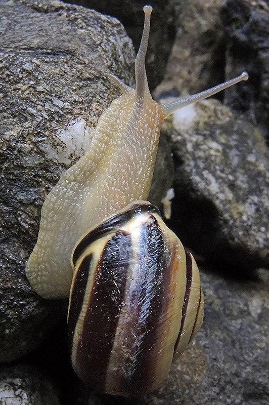 Gehäusehöhe bis 17 mm, Gehäusebreite bis 25 mm. Fundort: Garten, an Steinmauer kriechend. |