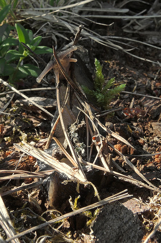 Die Sohle ist von Nadeln und Rindenstücken verdeckt. Informationen zum Tier: Art: Sarner Schnegel (Limax sarnensis). |