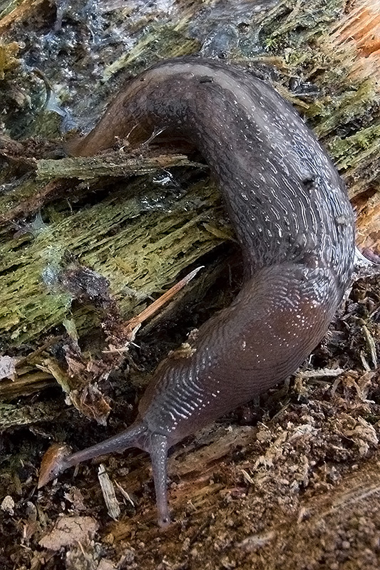 Es befinden sich aktuell noch 5 Schnecken in der Aufzucht. Der Rest der geschlüpften Tiere wurde zu Beginn des überaus milden Januars am Fundort der Eier in die Freiheit entlassen. Die verbliebenen Tiere erreichen nun ein Alter von 4 Monaten. Die Säuberung des Terrariums und die damit verbundene Umplazierung bietet eine gute Gelegenheit für eine fotographische Bestandesaufnahme. Schnecke 2 weist eine Körperlänge von 50 mm auf. Das Rückenschild ist braun. Der Rücken selbst ist dunkler und weist seitlich hellere Flecken auf. Der Kiel ist gräulichweiss. Die Fühler und der Kopf sind mit der für Schnegel typischen Punktierung versehen. Die Sohle ist einfarbig und weist noch keinerlei Spuren einer farblichen Dreiteilung auf. Informationen zum Tier: Art: Schwarzer Schnegel (Limax cinereoniger). |