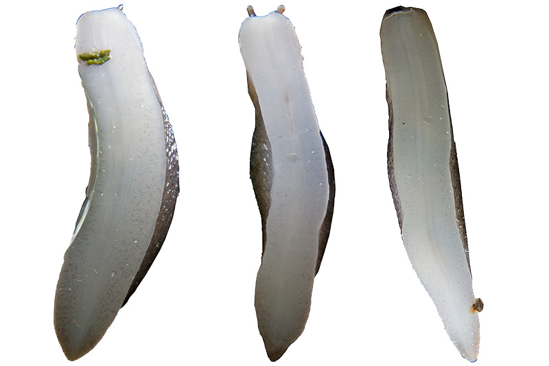 Waren gegen Ende Januar die Sohlen sämtlicher Tiere noch einheitlich einfarbig, hat nun im Verlauf der letzten Woche die Ausprägung der dunkler gefärbten Seitenbereiche der Sohle begonnen. Erste gebildete Farbpunkte sind bereits gut erkennbar. Links ist die Sohle der Schnecke 1, in der Mitte diejenige der Schnecke 4 sowie rechts diejenige der Schnecke 2 abgebildet. Bei den anderen beiden Exemplaren ist die Bildung der Aussenbereiche noch ausstehend. Informationen zum Tier: Art: Schwarzer Schnegel (Limax cinereoniger). |