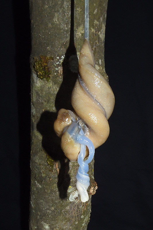 Paarungsablauf Limax cf. strobeli Die endgültige Länge des Schleimfadens variiert von etwa 30 cm bis zu gemäss Literaturangaben 100 cm. Bei dieser Paarung weist der Schleimfaden eine Länge von 31 cm auf. Informationen zum Tier: Art: Blauköpfiger Schnegel (Limax cf. strobeli). |