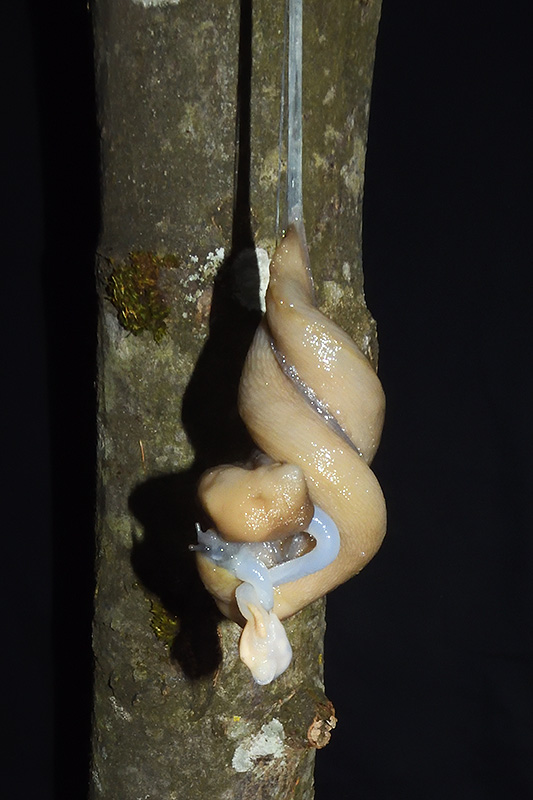 Paarungsablauf Limax cf. strobeli Die endgültige Länge des Schleimfadens variiert von etwa 30 cm bis zu gemäss Literaturangaben 100 cm. Bei dieser Paarung weist der Schleimfaden eine Länge von 31 cm auf. Informationen zum Tier: Art: Blauköpfiger Schnegel (Limax cf. strobeli). |