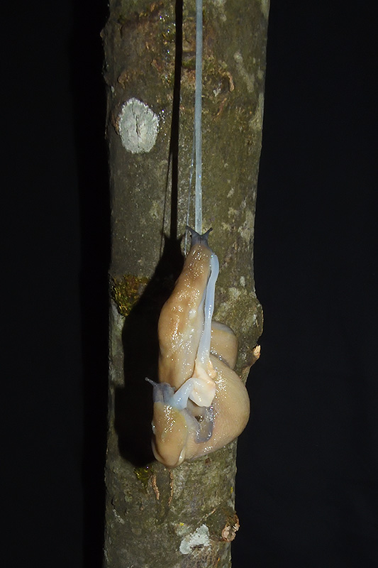 Paarungsablauf Limax cf. strobeli Die endgültige Länge des Schleimfadens variiert von etwa 30 cm bis zu gemäss Literaturangaben 100 cm. Bei dieser Paarung weist der Schleimfaden eine Länge von 31 cm auf. Informationen zum Tier: Art: Blauköpfiger Schnegel (Limax cf. strobeli). |