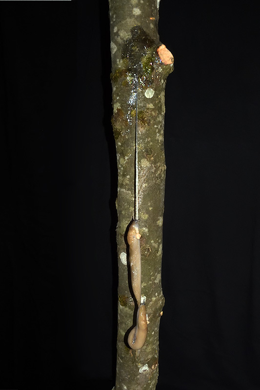 Die endgültige Länge des Schleimfadens variiert von etwa 30 cm bis zu gemäss Literaturangaben 100 cm. Der Schleimfaden dieser Paarung weist eine Länge von 31 cm auf. Informationen zum Tier: Art: Blauköpfiger Schnegel (Limax cf. strobeli). |