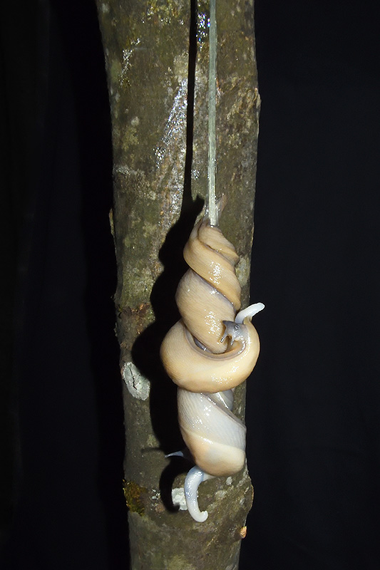 Paarungsablauf Limax cf. strobeli Die endgültige Länge des Schleimfadens variiert von etwa 30 cm bis zu gemäss Literaturangaben 100 cm. Bei dieser Paarung weist der Schleimfaden eine Länge von 62 cm auf. Informationen zum Tier: Art: Blauköpfiger Schnegel (Limax cf. strobeli). |