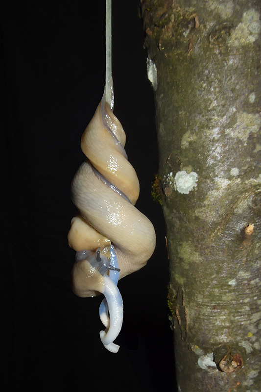 Paarungsablauf Limax cf. strobeli Die endgültige Länge des Schleimfadens variiert von etwa 30 cm bis zu gemäss Literaturangaben 100 cm. Bei dieser Paarung weist der Schleimfaden eine Länge von 62 cm auf. Informationen zum Tier: Art: Blauköpfiger Schnegel (Limax cf. strobeli). |