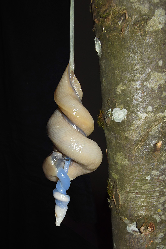 Paarungsablauf Limax cf. strobeli Die endgültige Länge des Schleimfadens variiert von etwa 30 cm bis zu gemäss Literaturangaben 100 cm. Bei dieser Paarung weist der Schleimfaden eine Länge von 62 cm auf. Informationen zum Tier: Art: Blauköpfiger Schnegel (Limax cf. strobeli). |