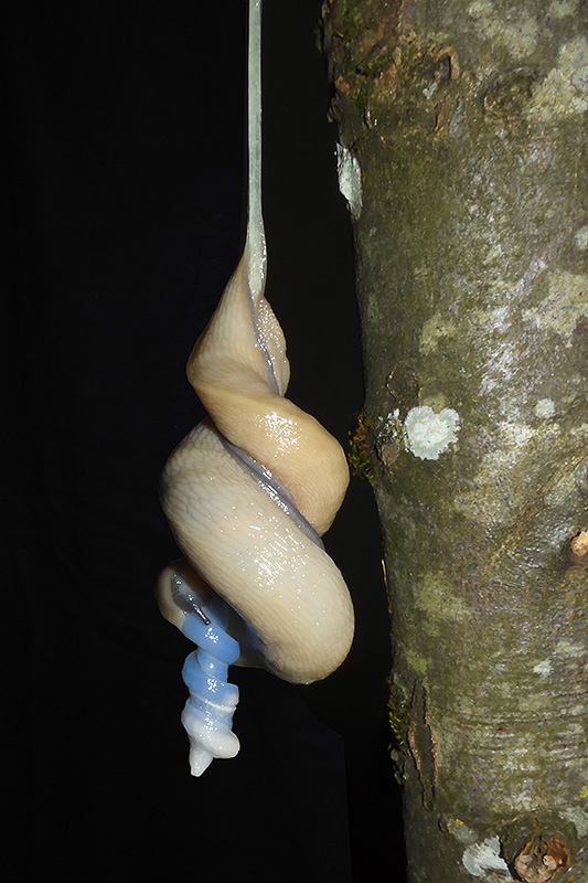 Paarungsablauf Limax cf. strobeli Die endgültige Länge des Schleimfadens variiert von etwa 30 cm bis zu gemäss Literaturangaben 100 cm. Bei dieser Paarung weist der Schleimfaden eine Länge von 62 cm auf. Informationen zum Tier: Art: Blauköpfiger Schnegel (Limax cf. strobeli). |