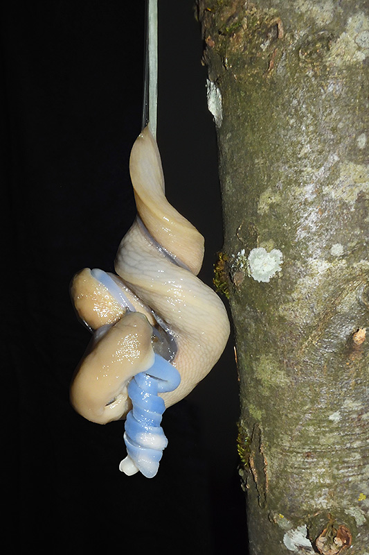 Paarungsablauf Limax cf. strobeli Die endgültige Länge des Schleimfadens variiert von etwa 30 cm bis zu gemäss Literaturangaben 100 cm. Bei dieser Paarung weist der Schleimfaden eine Länge von 62 cm auf. Informationen zum Tier: Art: Blauköpfiger Schnegel (Limax cf. strobeli). |