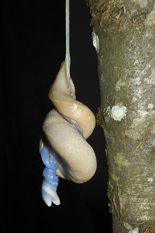 Paarungsablauf Limax cf. strobeli Die endgültige Länge des Schleimfadens variiert von etwa 30 cm bis zu gemäss Literaturangaben 100 cm. Bei dieser Paarung weist der Schleimfaden eine Länge von 62 cm auf. Informationen zum Tier: Art: Blauköpfiger Schnegel (Limax cf. strobeli). |