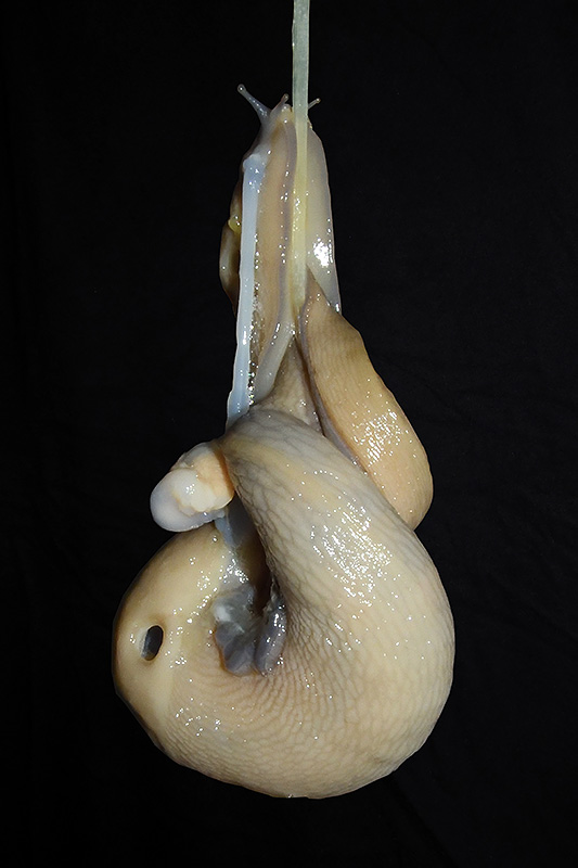 Paarungsablauf Limax cf. strobeli Die endgültige Länge des Schleimfadens variiert von etwa 30 cm bis zu gemäss Literaturangaben 100 cm. Bei dieser Paarung weist der Schleimfaden eine Länge von 62 cm auf. Informationen zum Tier: Art: Blauköpfiger Schnegel (Limax cf. strobeli). |