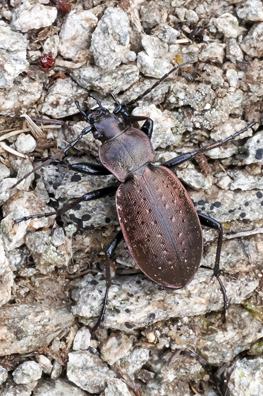 Am Südgrat des Pazolastocks krabbelt ein Bergwald-Laufkäfer auf der Pfadspur. Informationen zum Tier: Art: Bergwald-Laufkäfer (Carabus sylvestris). |