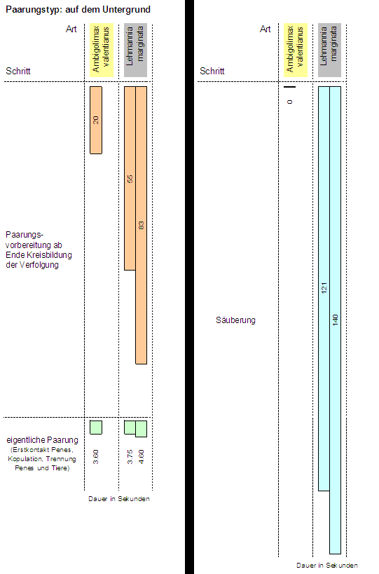 Vom Zusammentreffen zweier Tiere über die Verfolgung und Kopulation bis zur Trennung vergeht meist nur wenig mehr als eine Minute.