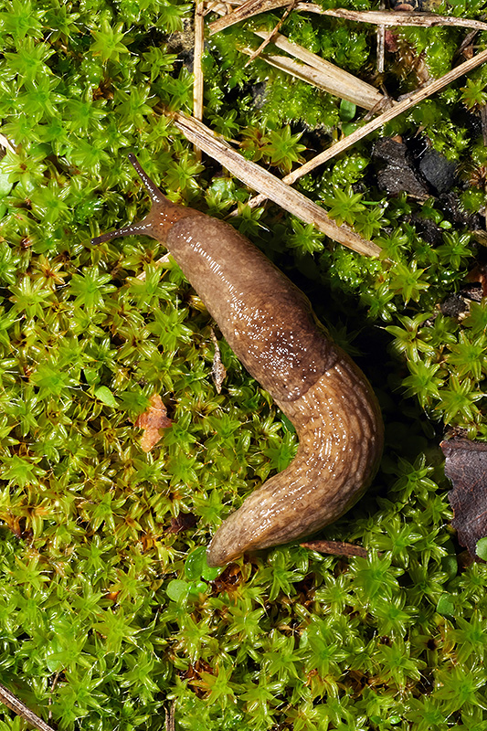 Der Schild dieser Schnecke ist deutlich dunkler gefärbt als der Hinterleib. Informationen zum Tier: Art: Deroceras spec. Zuordnung auf Grundlage äusserer Merkmale: Genetzte Ackerschnecke (Deroceras reticulatum). |